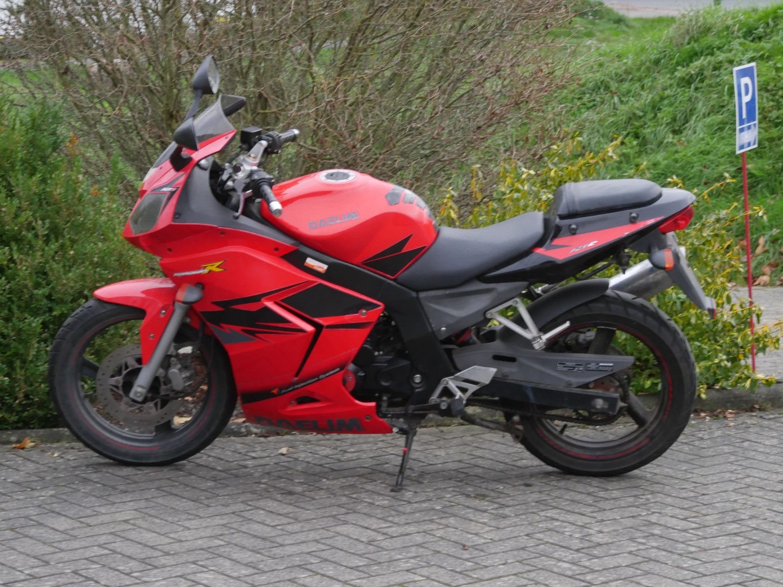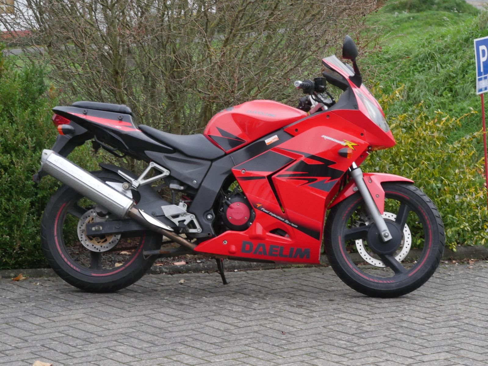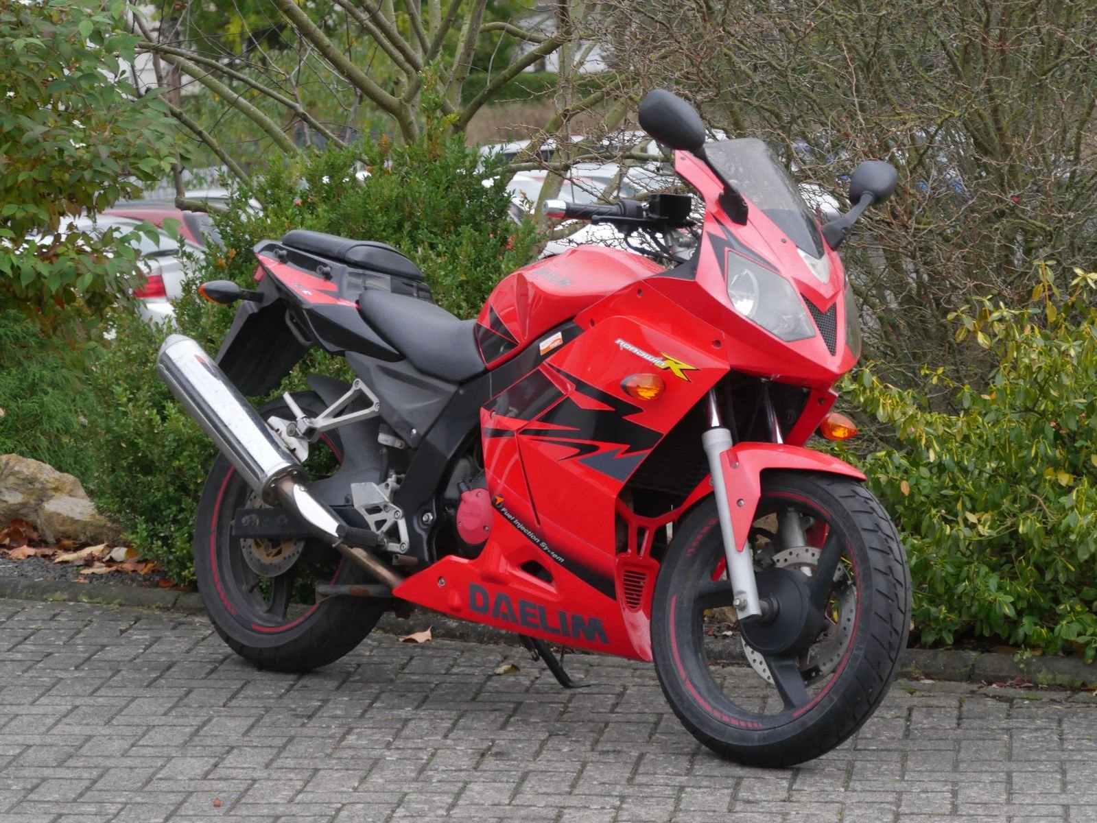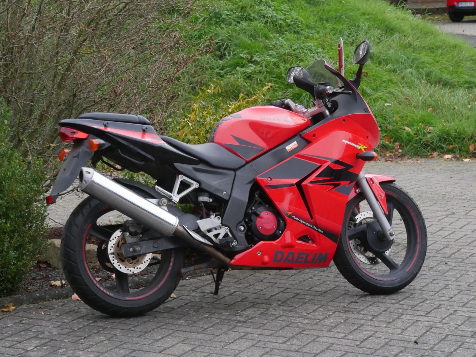 Reparaturbedürftige Daelim Roadwin R in vollverkleidetem Rot mit Scheibe und Edelstahlauspuffanlage.