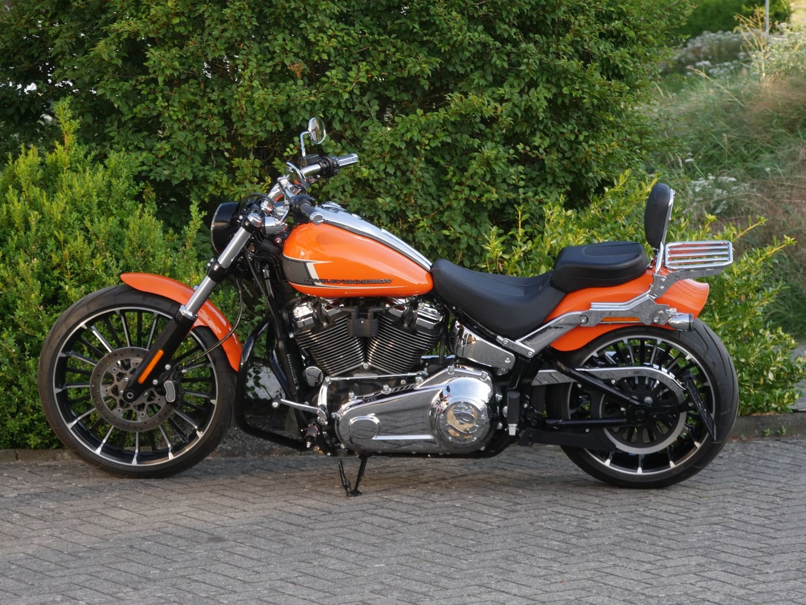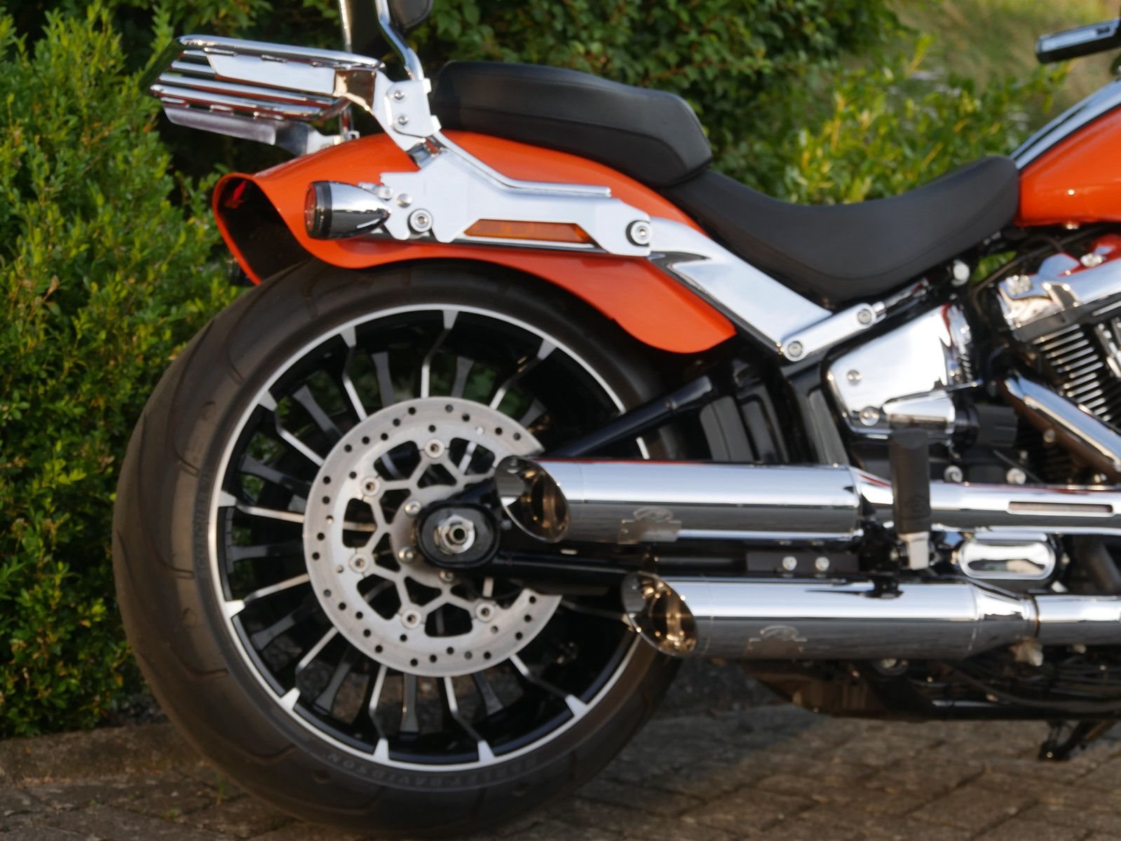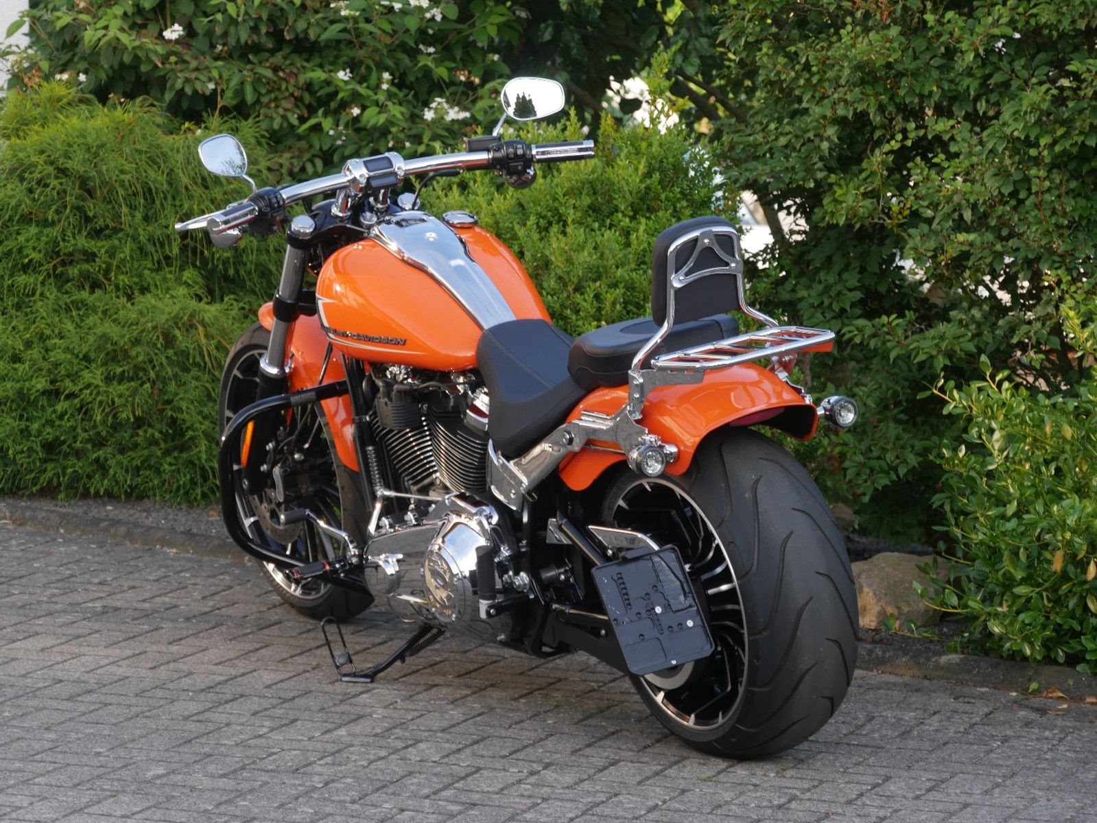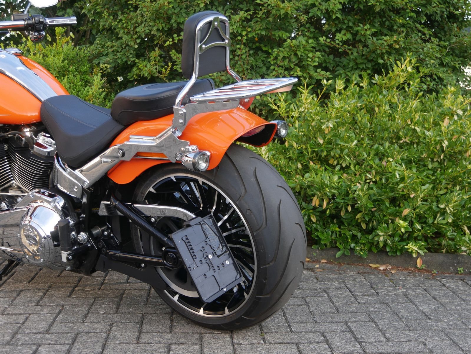 Neuwertige Harley-Davidson Breakout in schickem Orange mit folgender Ausstattung: Motorschutzbügel, abnehmbare Sissy-Bar mit Gepäckträger, HD-Griffe, Soziuskomfort- Sitz, Extra Kupplungsdeckel, Harley Zubehör- Fußrasten, abschließbarer Tankdeckel, seitlicher Kennzeichenhalter von Wunderlich und Jeckil & Hyde Klappenauspuffanlage. Die Breakout hat bereits 2 Inspektionen beim Harley- Händler bekommen, die letzte am 02.09.2025 beim Km- Stand 4959.
