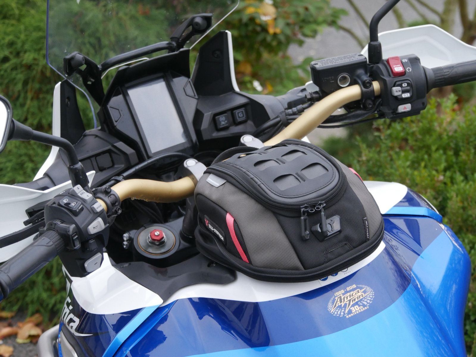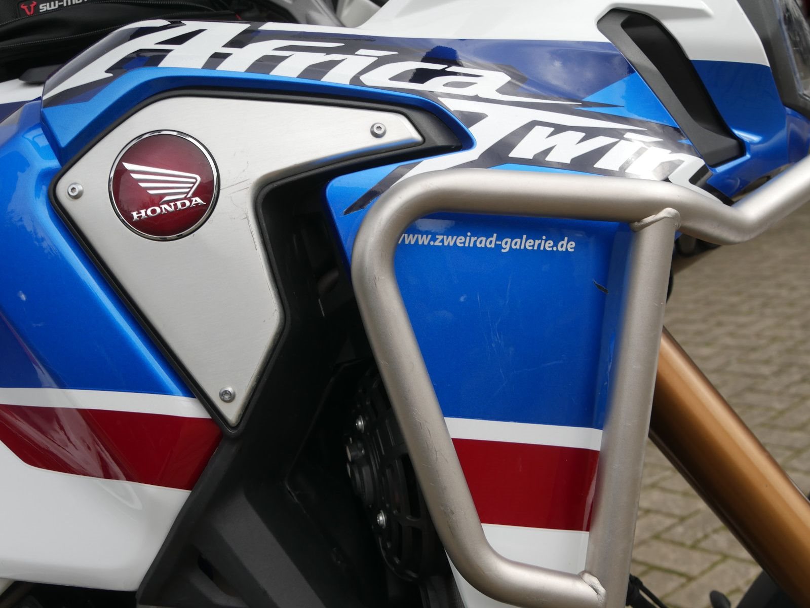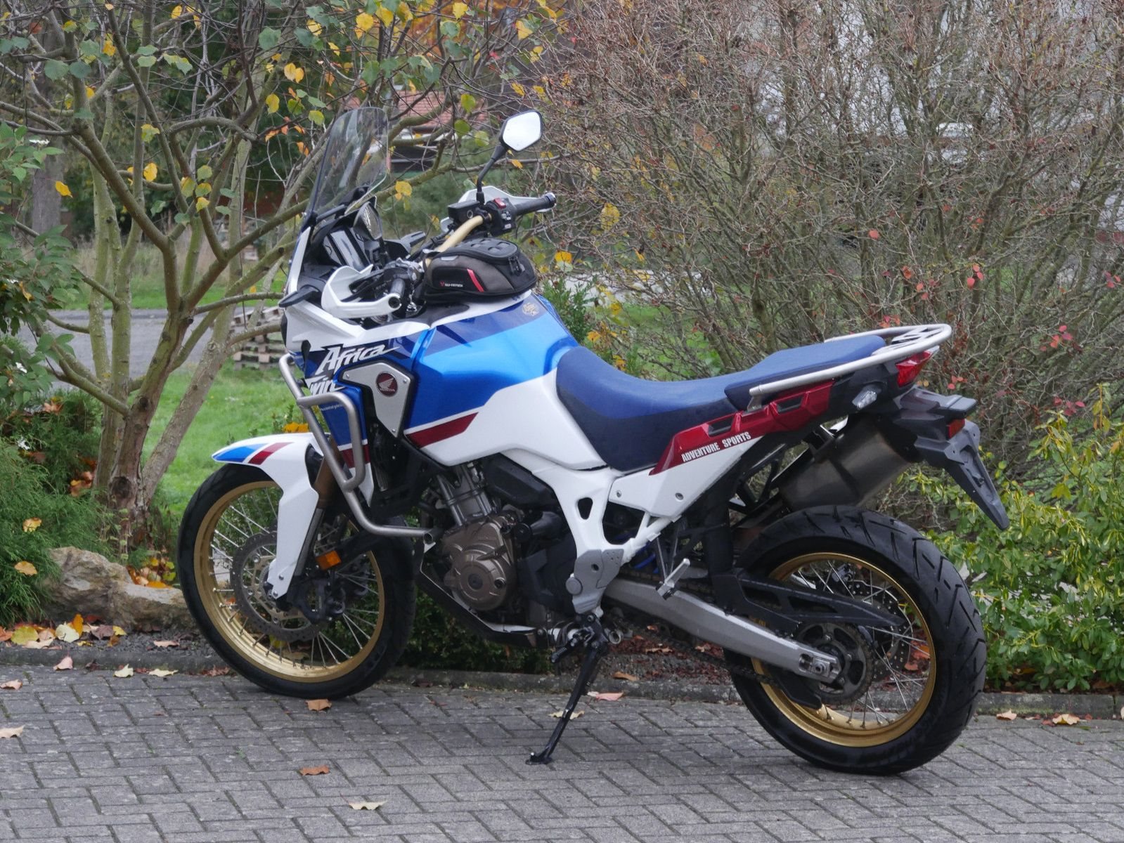 Honda CRF 1000 DCT Adv Sports in schickem Tricolor Look mit folgender Ausstattung: SW-Motech Tanktasche, Sturzbügel, tiefergelegte Fußrasten und Griffheizung. Die Honda hat 5 Inspektionen bekommen, die letzte am 28.03.2025 bei 7705 km.