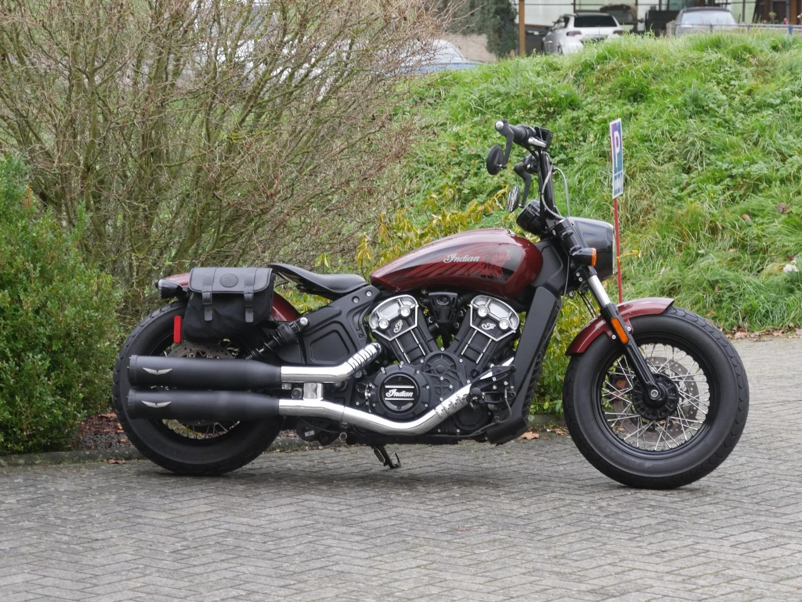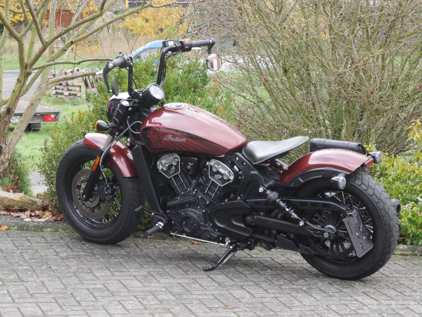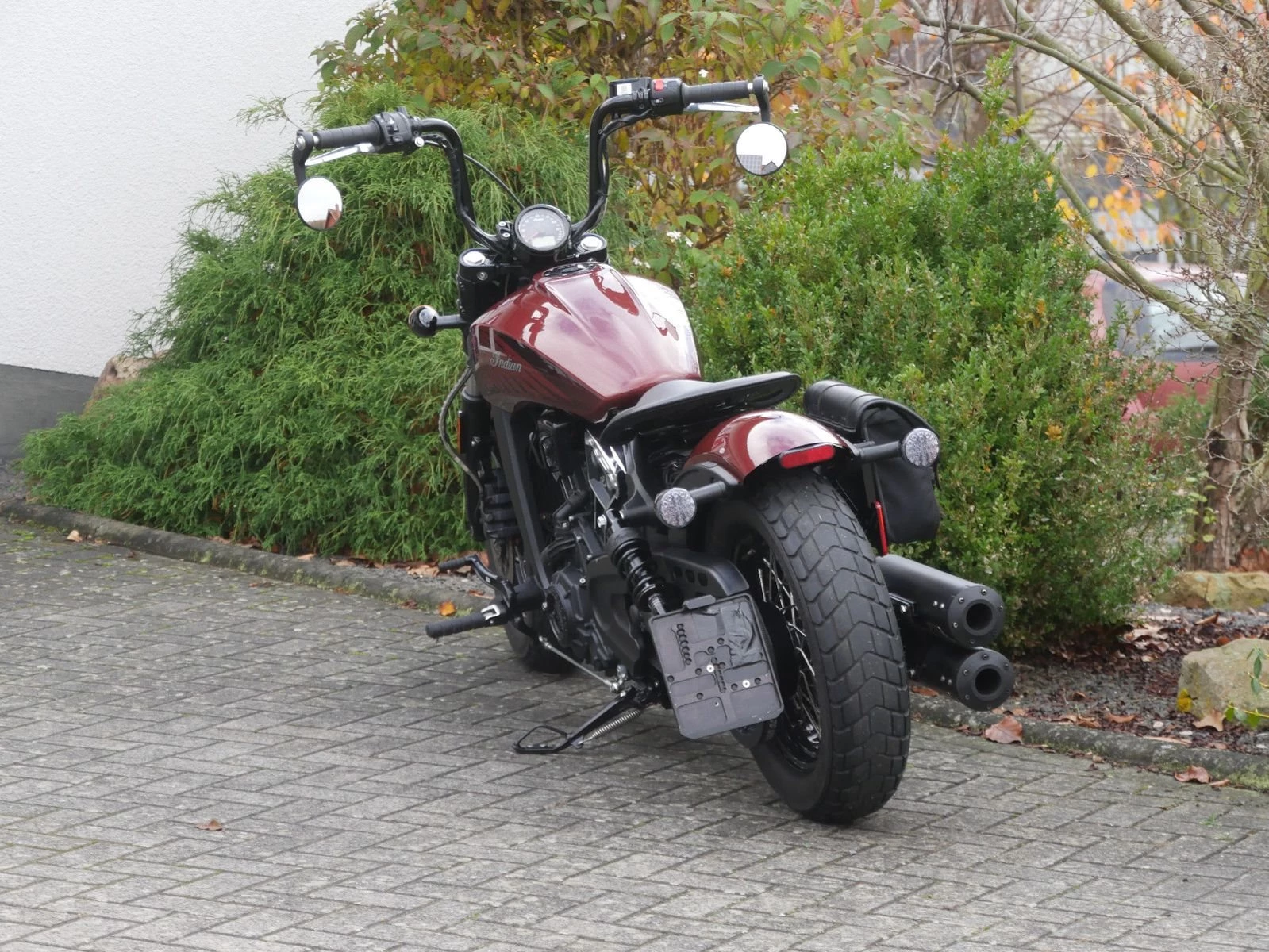 Schicke, sehr gepflegte Indian Scout Bobber Twenty mit einer Leder- Tasche rechts und seitlichem Kennzeichenhalter links.