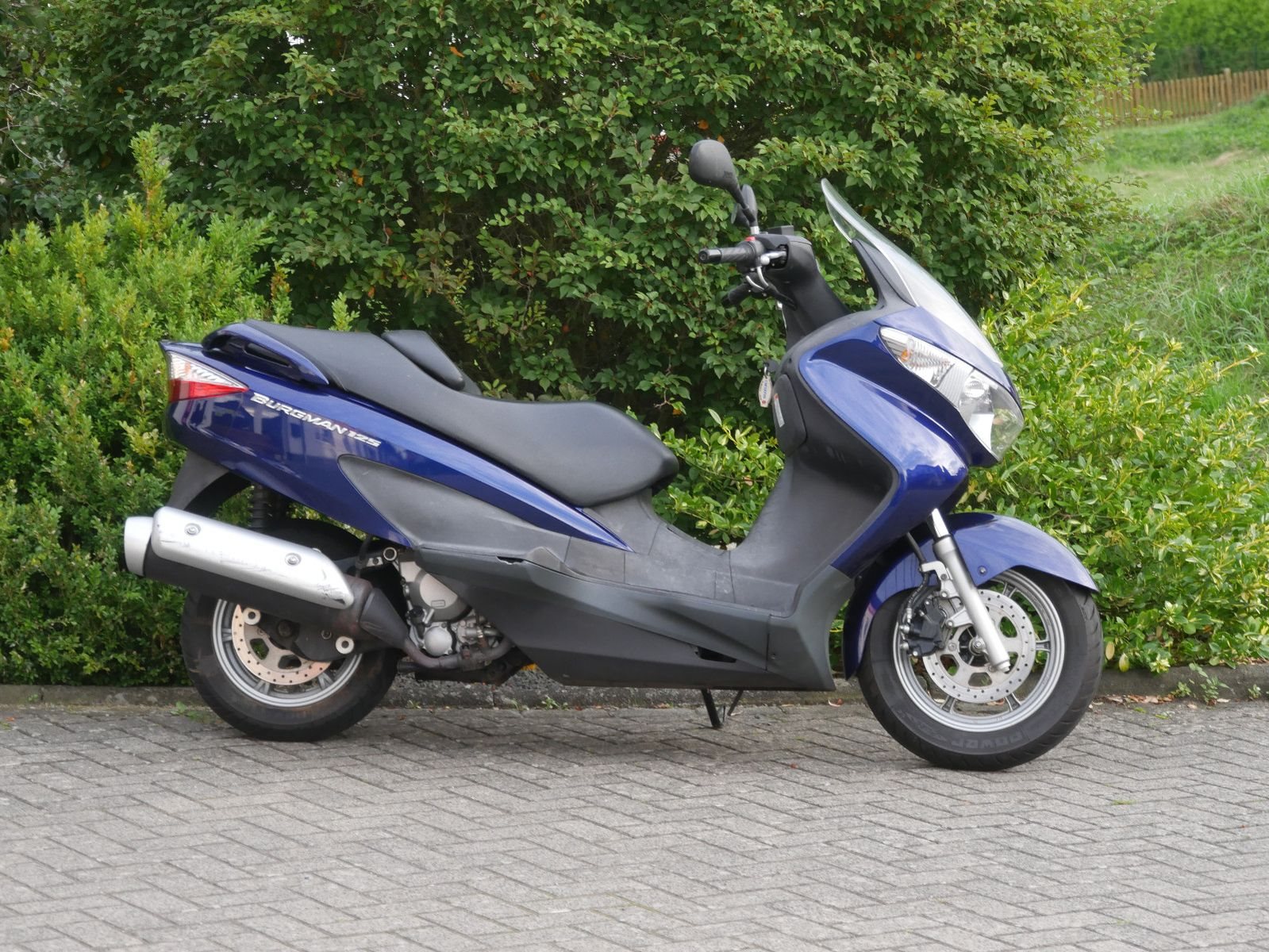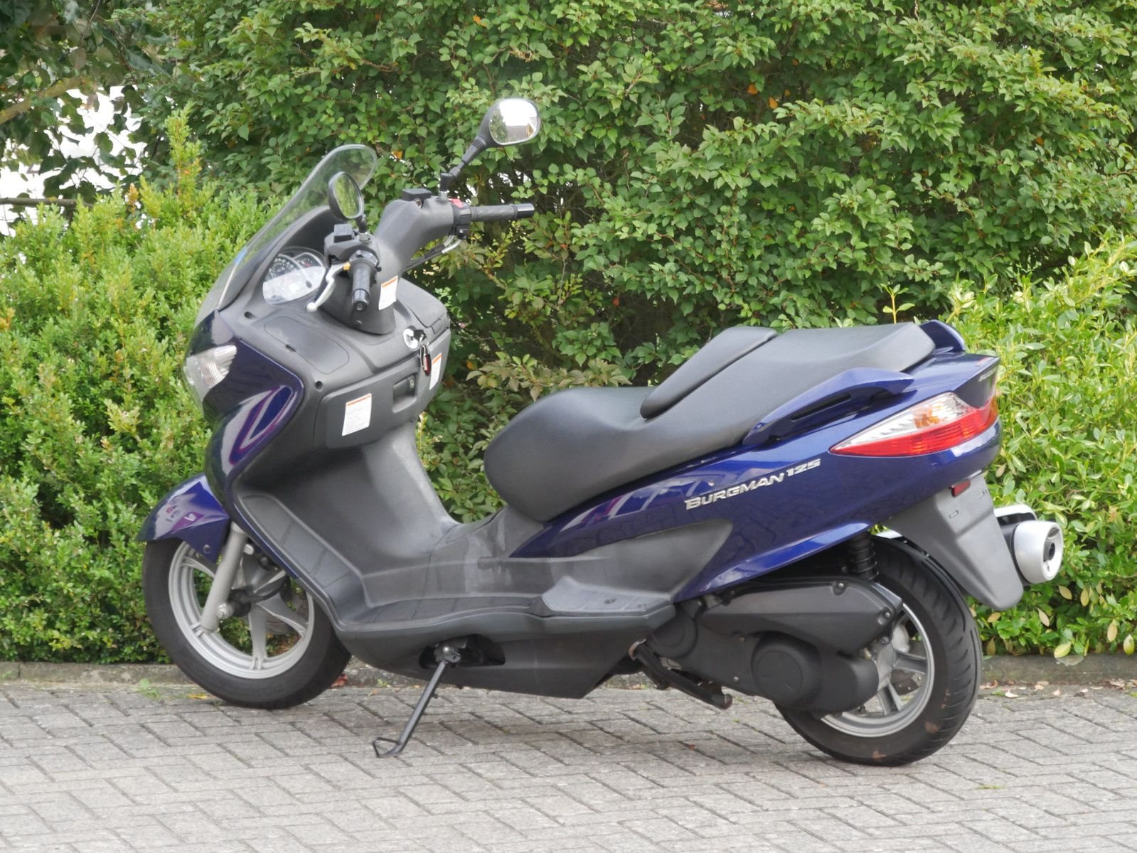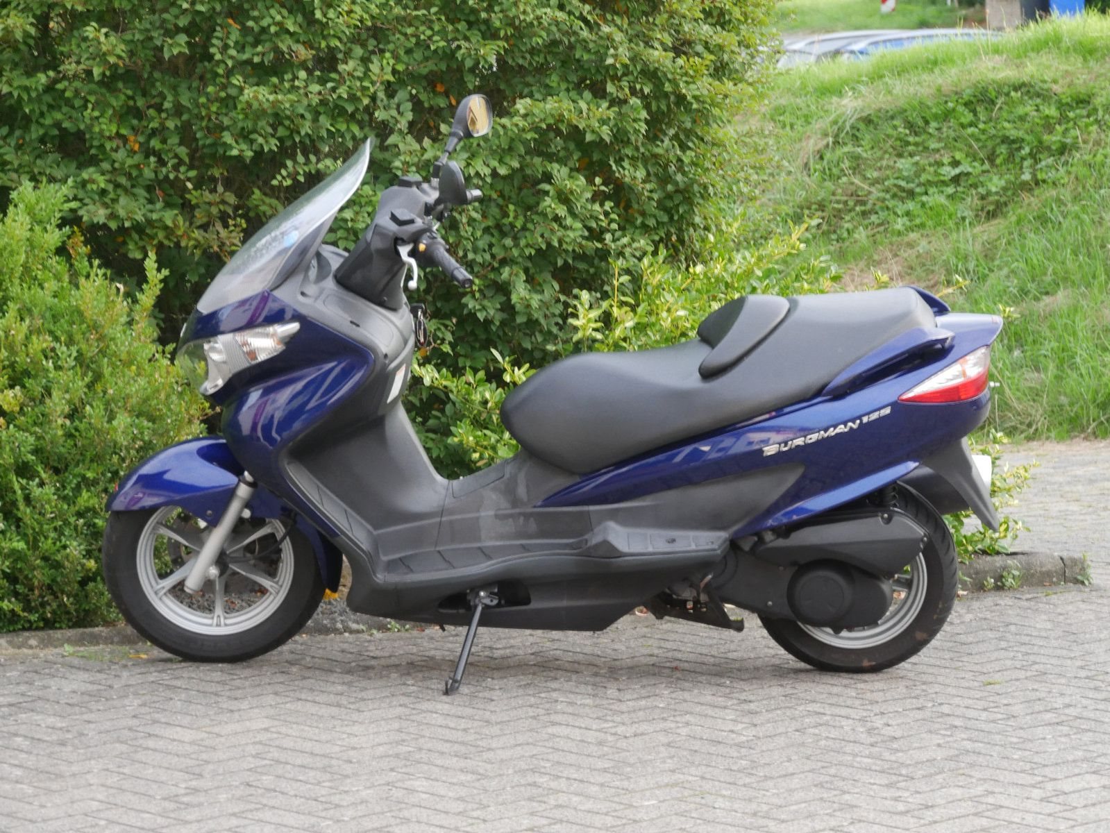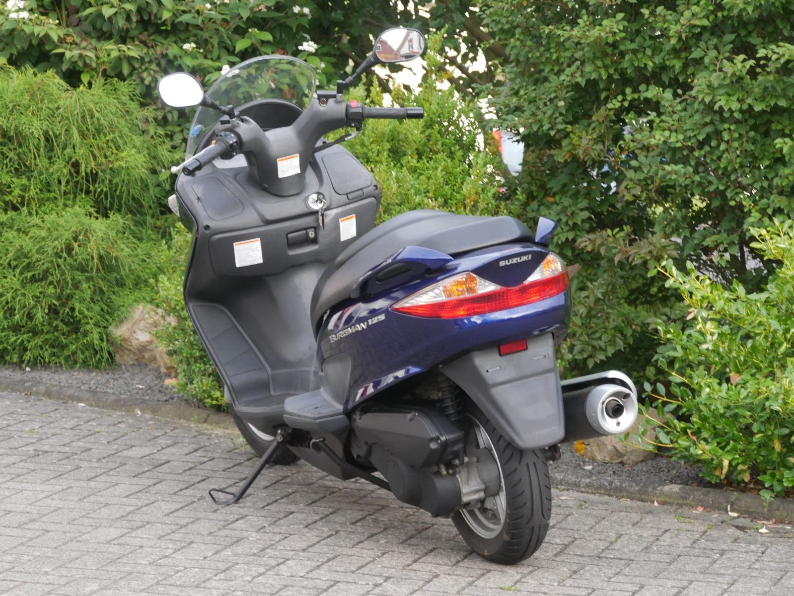 Suzuki Burgman 125 mit Einspritzmotor in blau mit Windschild, integrierten Blinkern und Mittelständer.