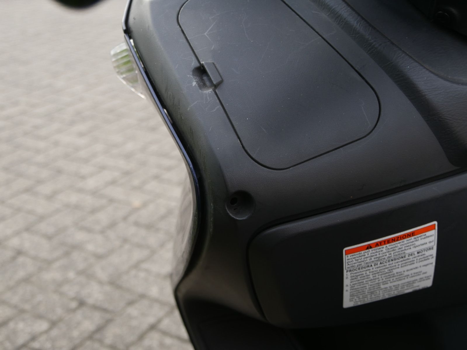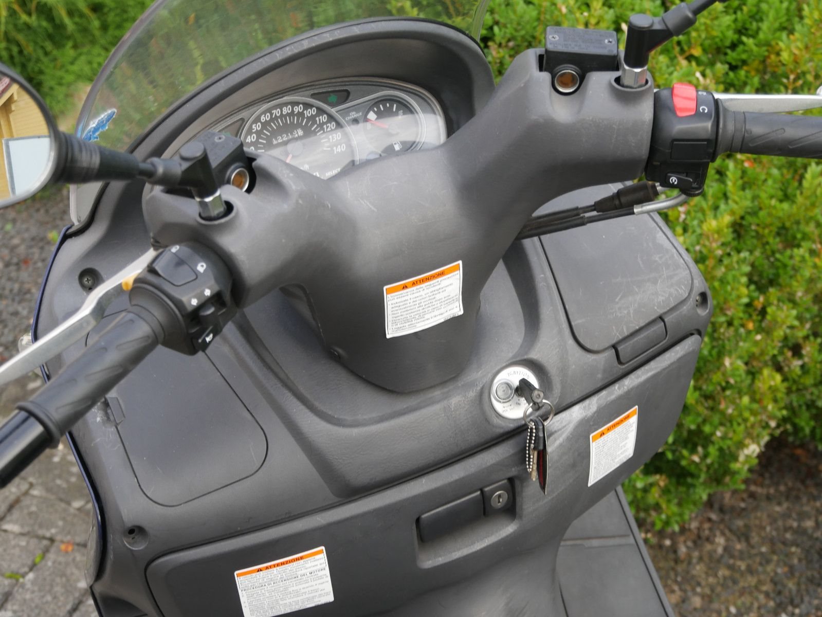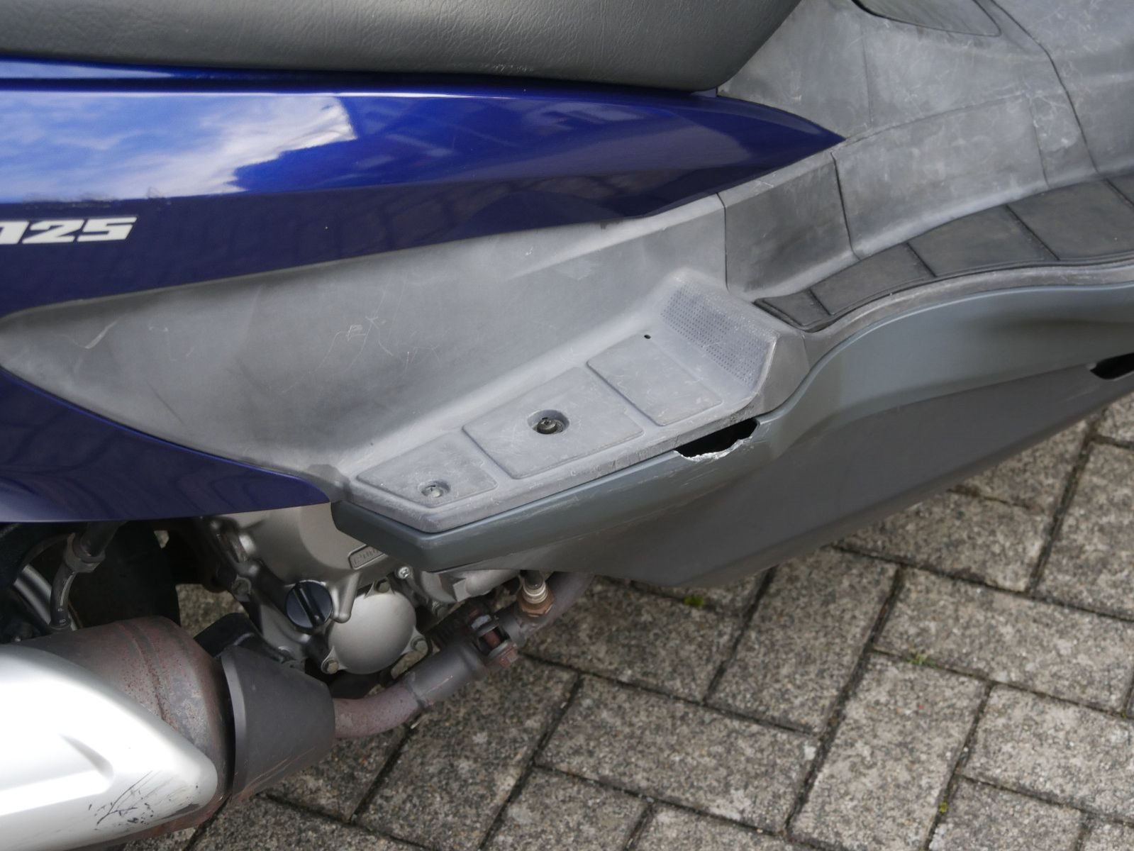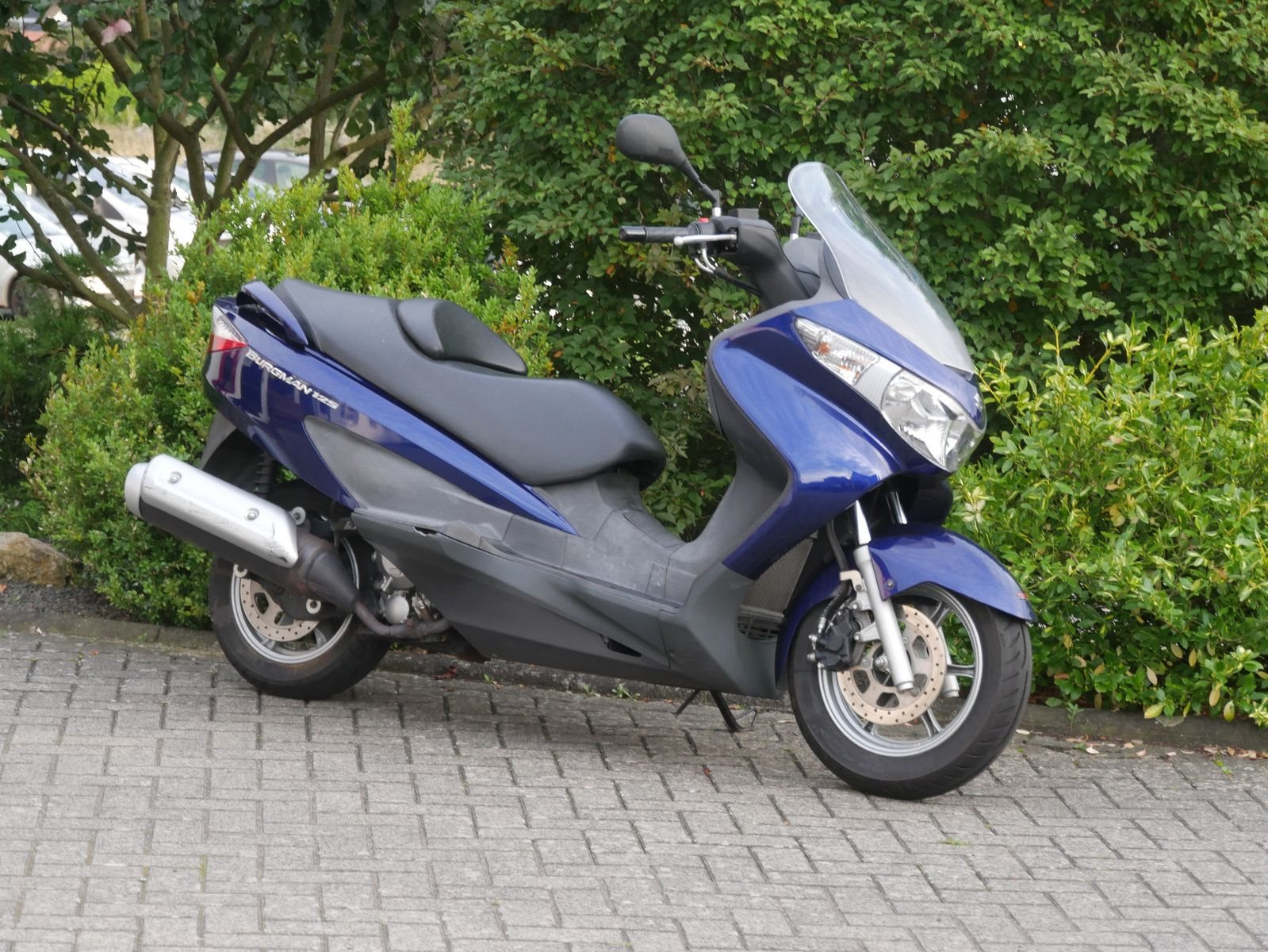 Suzuki Burgman 125 mit Einspritzmotor in blau mit Windschild, integrierten Blinkern und Mittelständer.