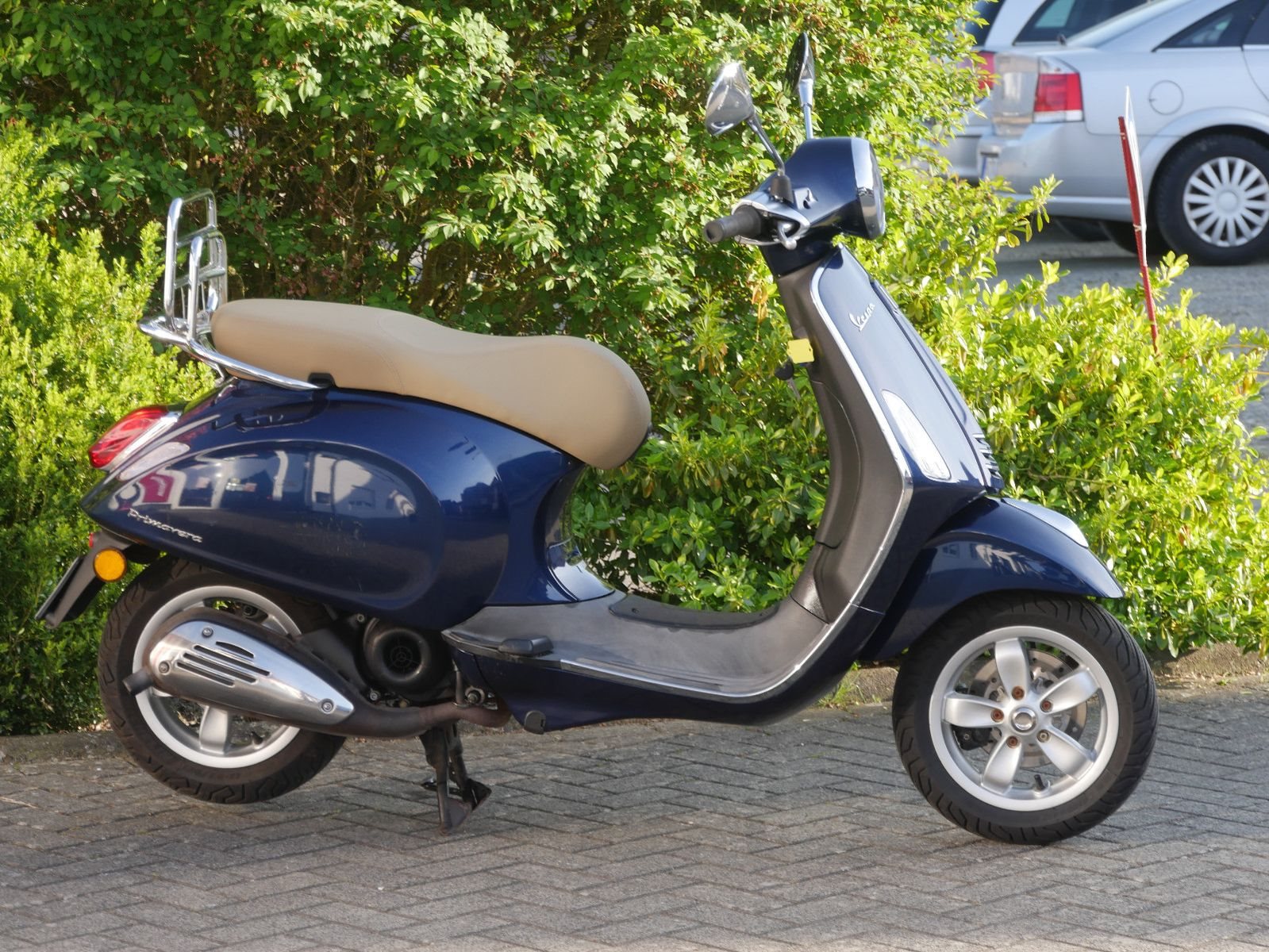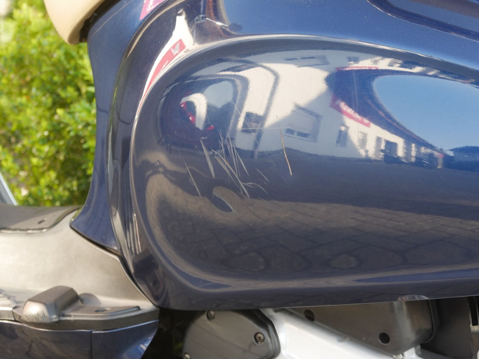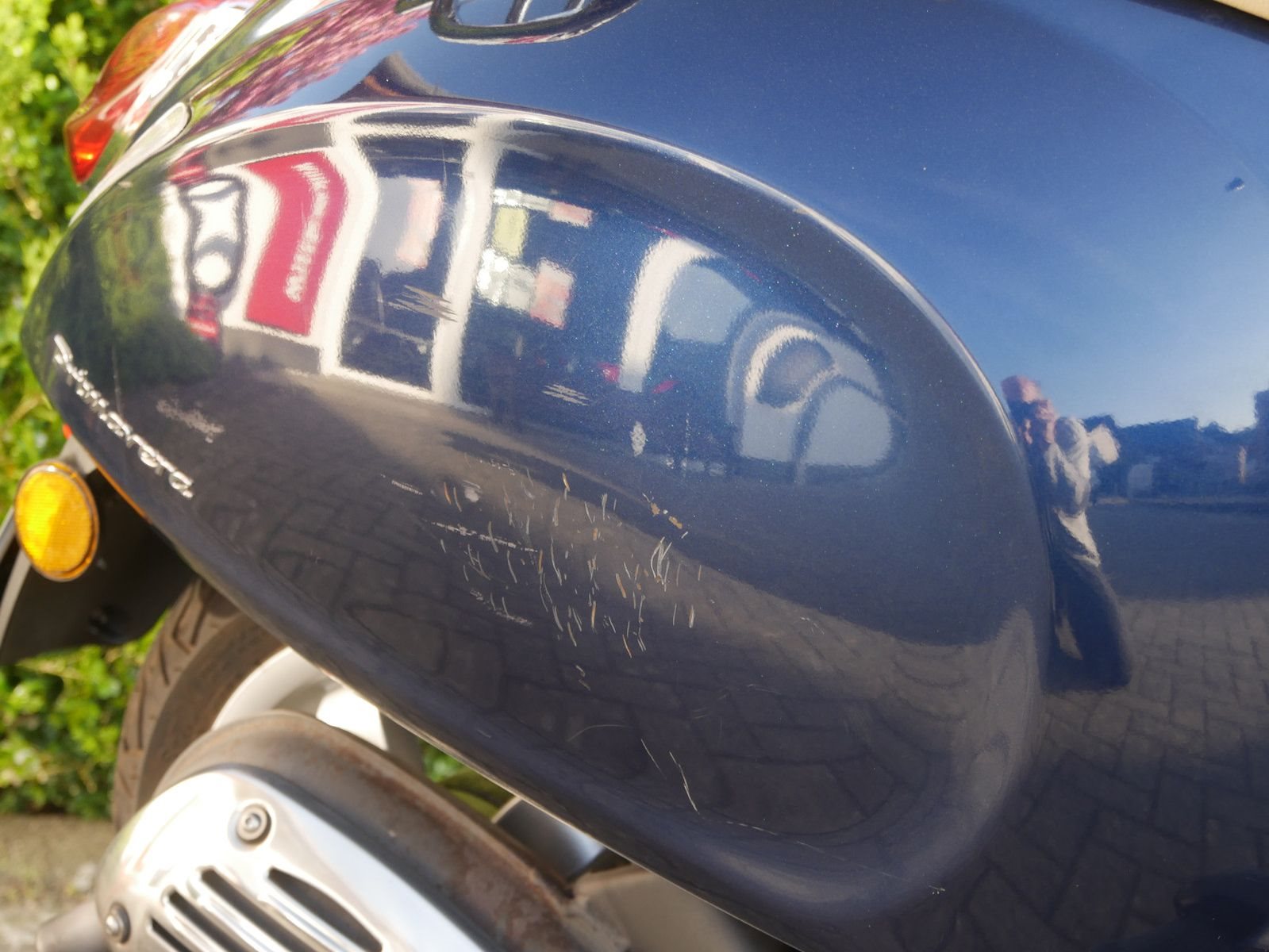 Vespa Primavera 50 in blau als kräftiger 2- Takter. Die Vespa ist in gutem Zustand, beide Reifen sind neu, hat jedoch auf beiden Seiten durch Umkippen Kratzer.