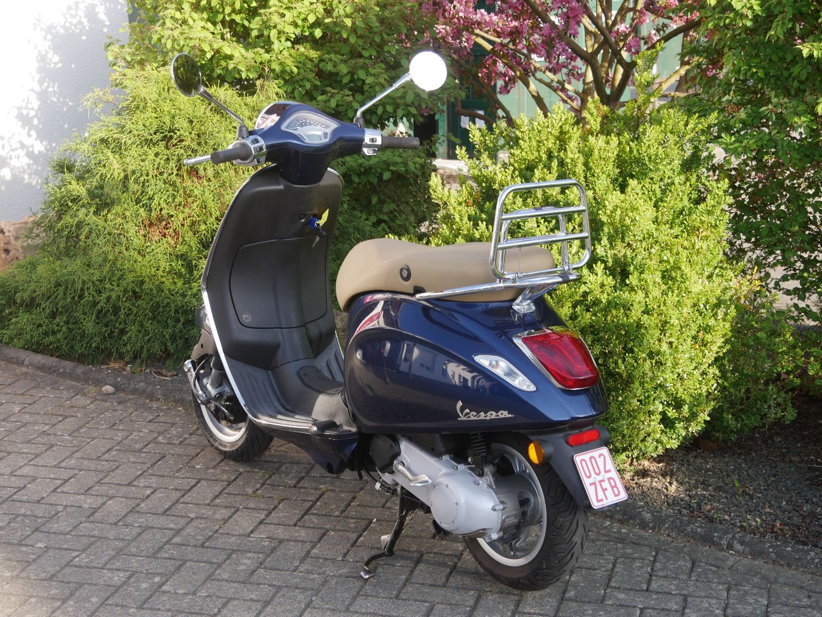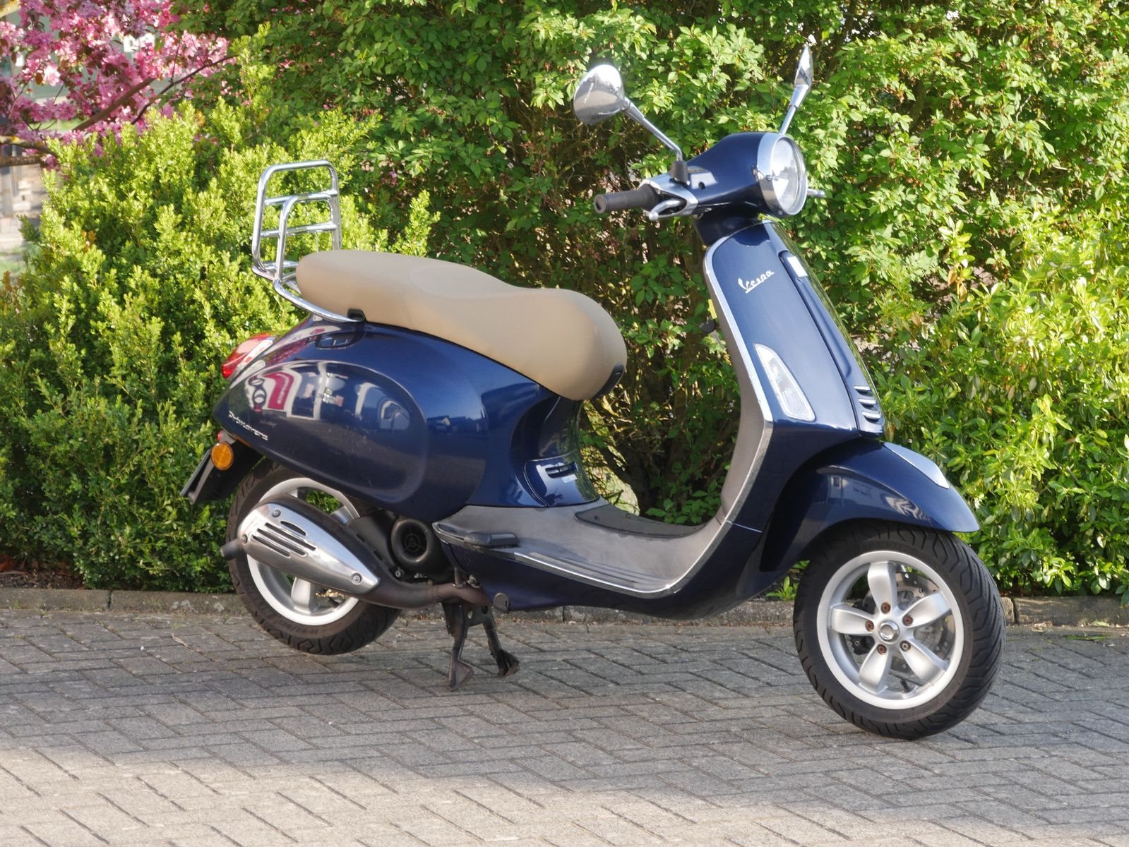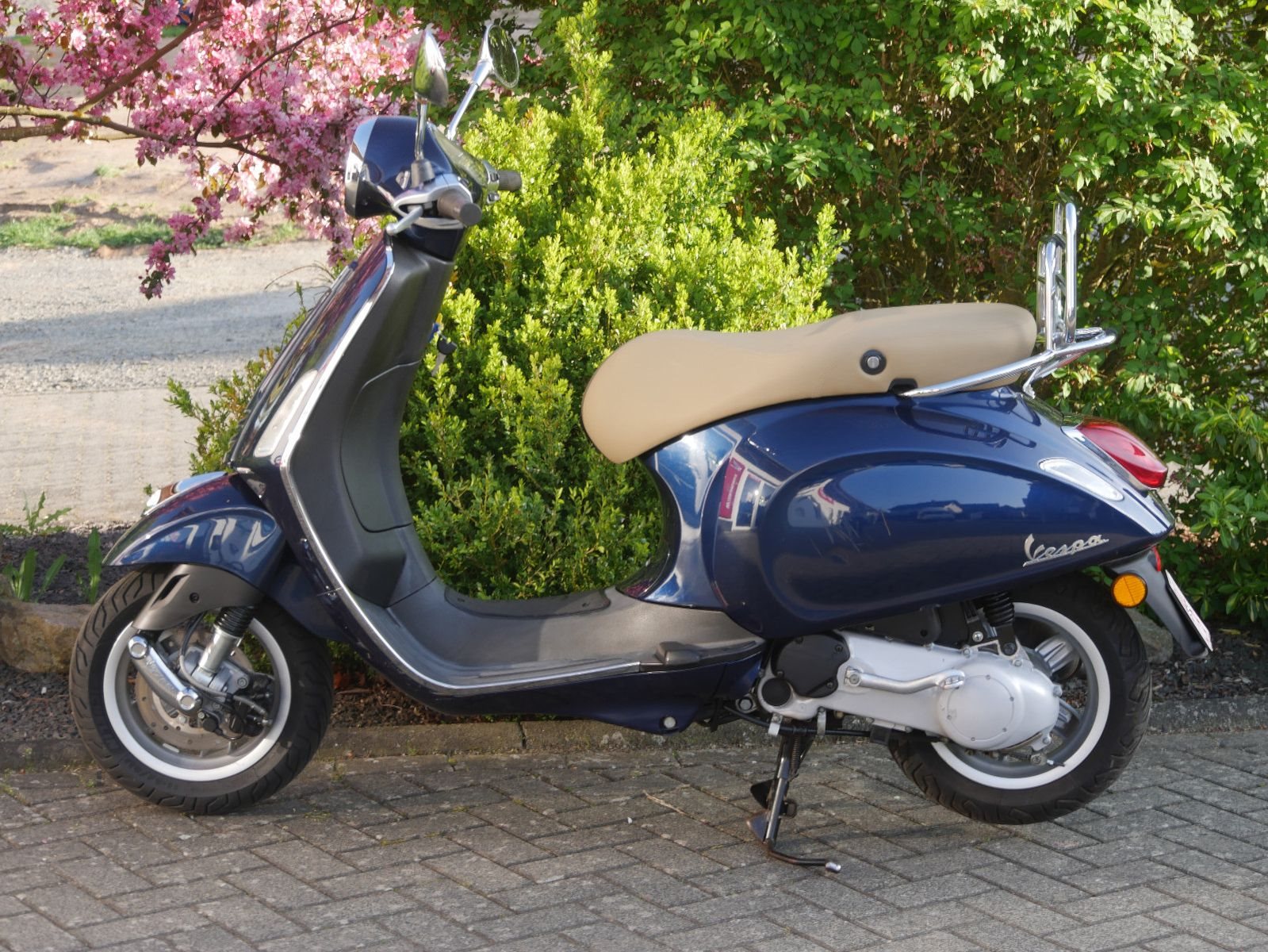 Vespa Primavera 50 in blau als kräftiger 2- Takter. Die Vespa ist in gutem Zustand, beide Reifen sind neu, hat jedoch auf beiden Seiten durch Umkippen Kratzer.