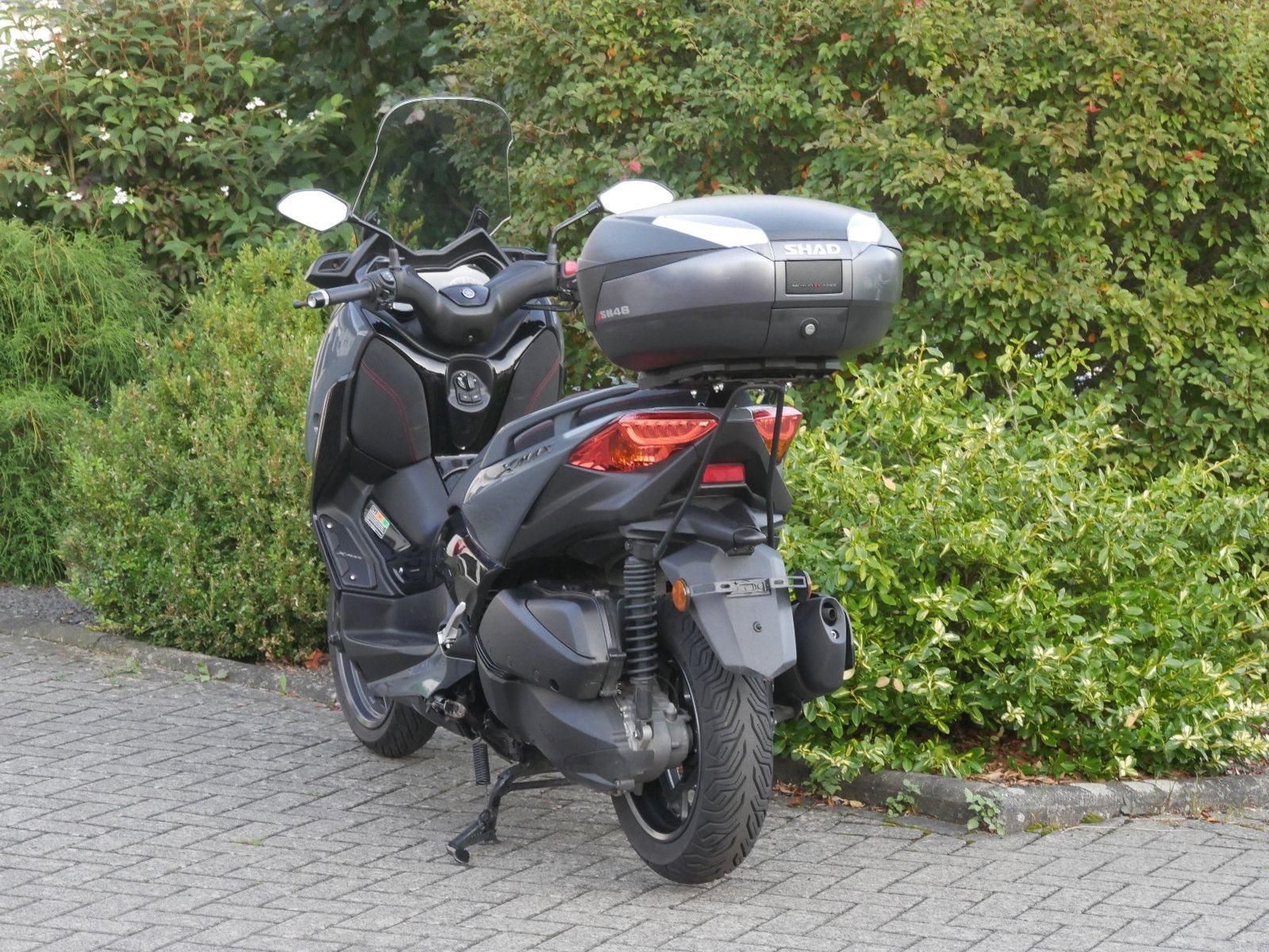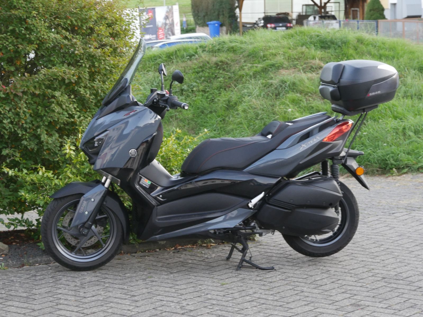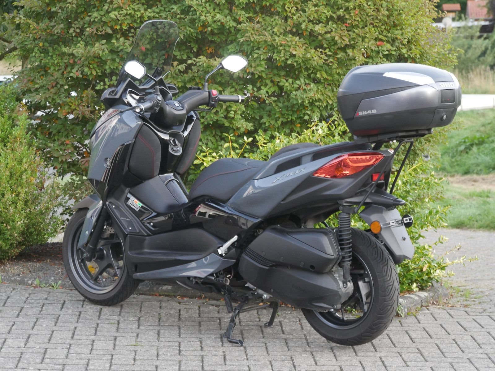 Schicker umkippfreier Yamaha X-Max 300 Tech Max in grau/ schwarz mit SHAD SH48 Topcase und Rückenlehne. Der X- Max hat bisher 3 Wartungen bekommen, die letze im April 2024 bei Km- Strand 7891. Vor der Auslieferung bekommt der Roller noch einen frischen Service.