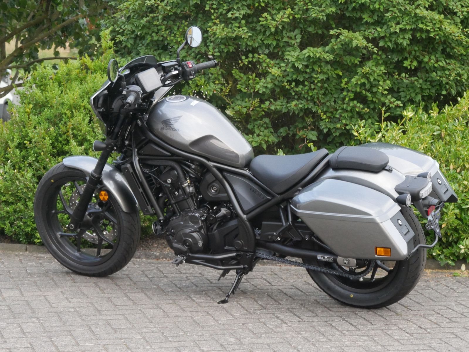 Neue Honda Rebell Tourer 2025 mit Koffern in grau metallic.