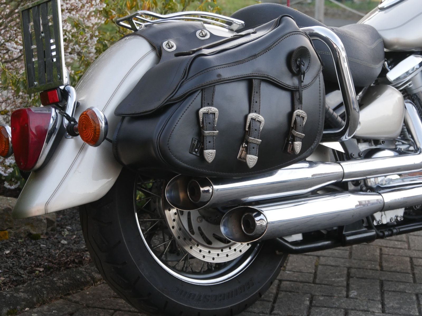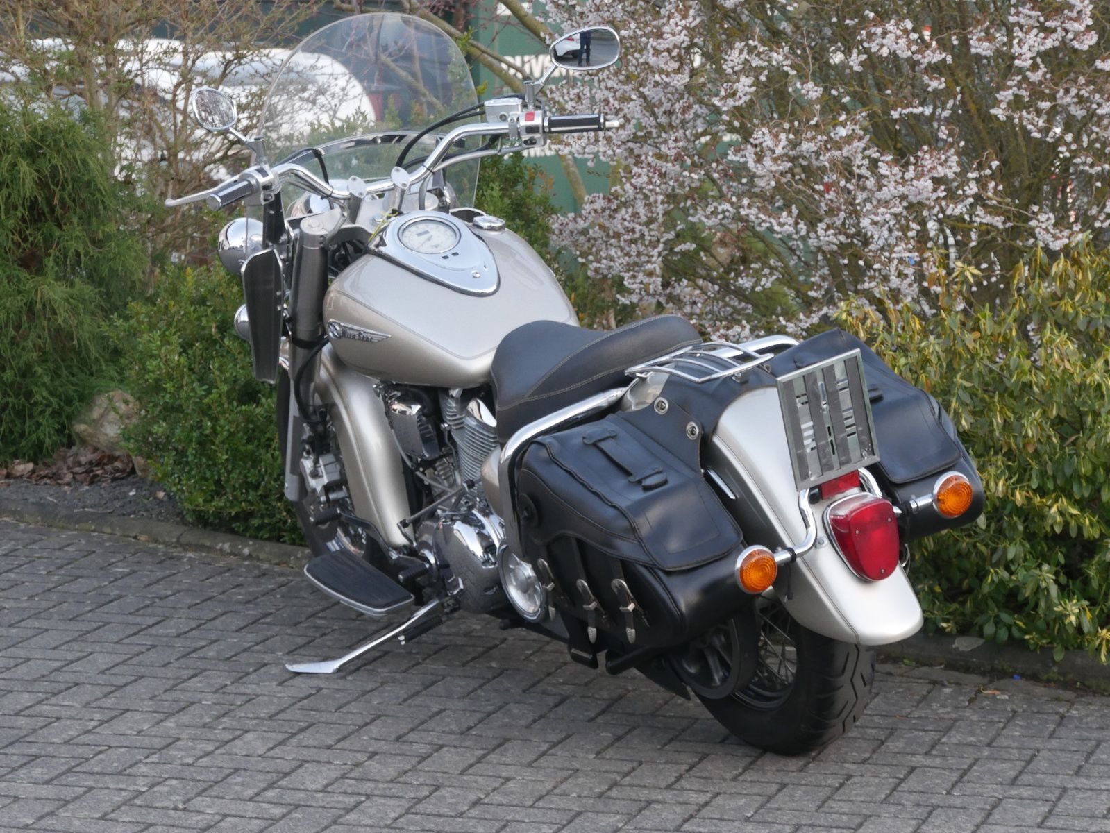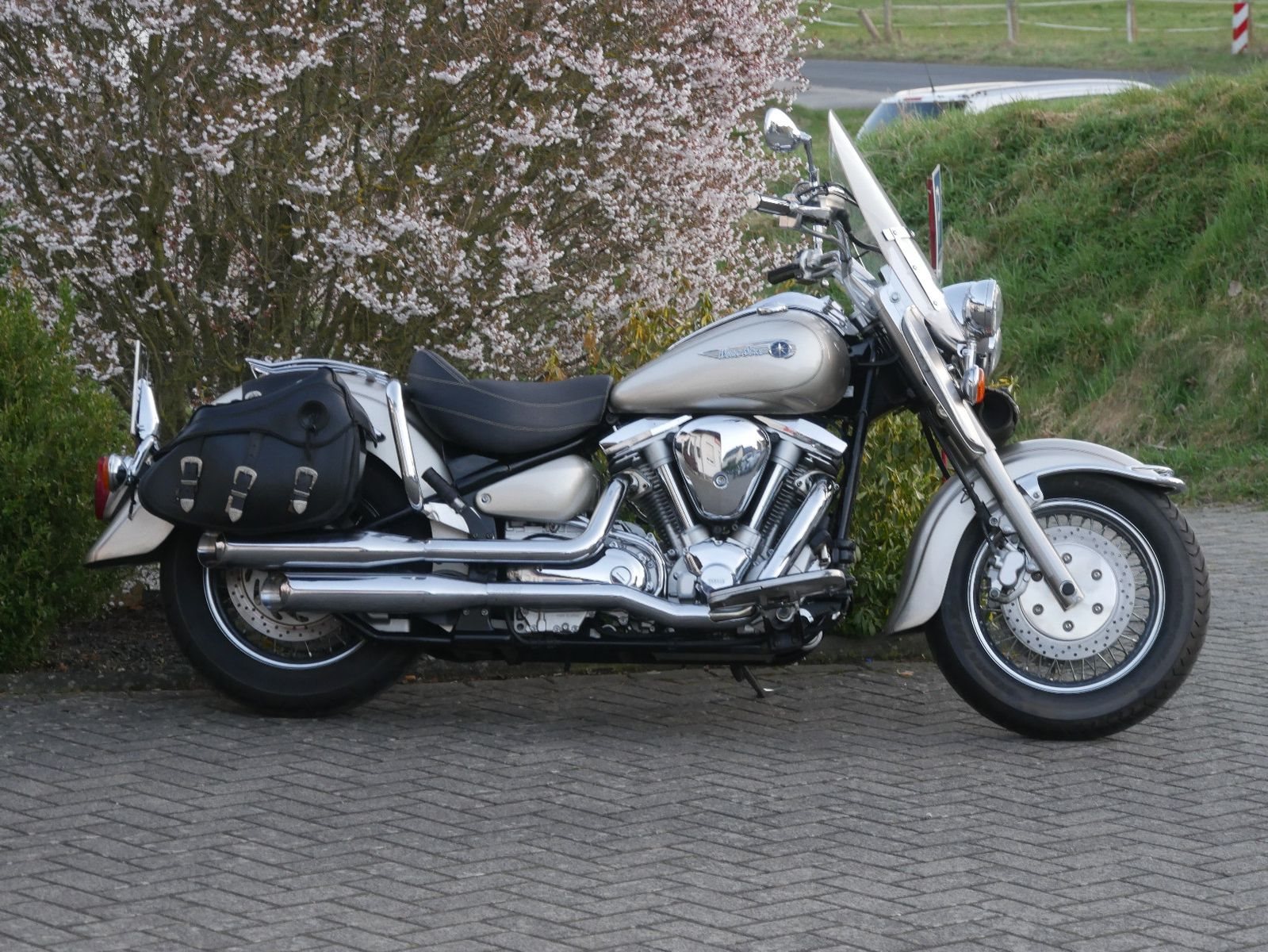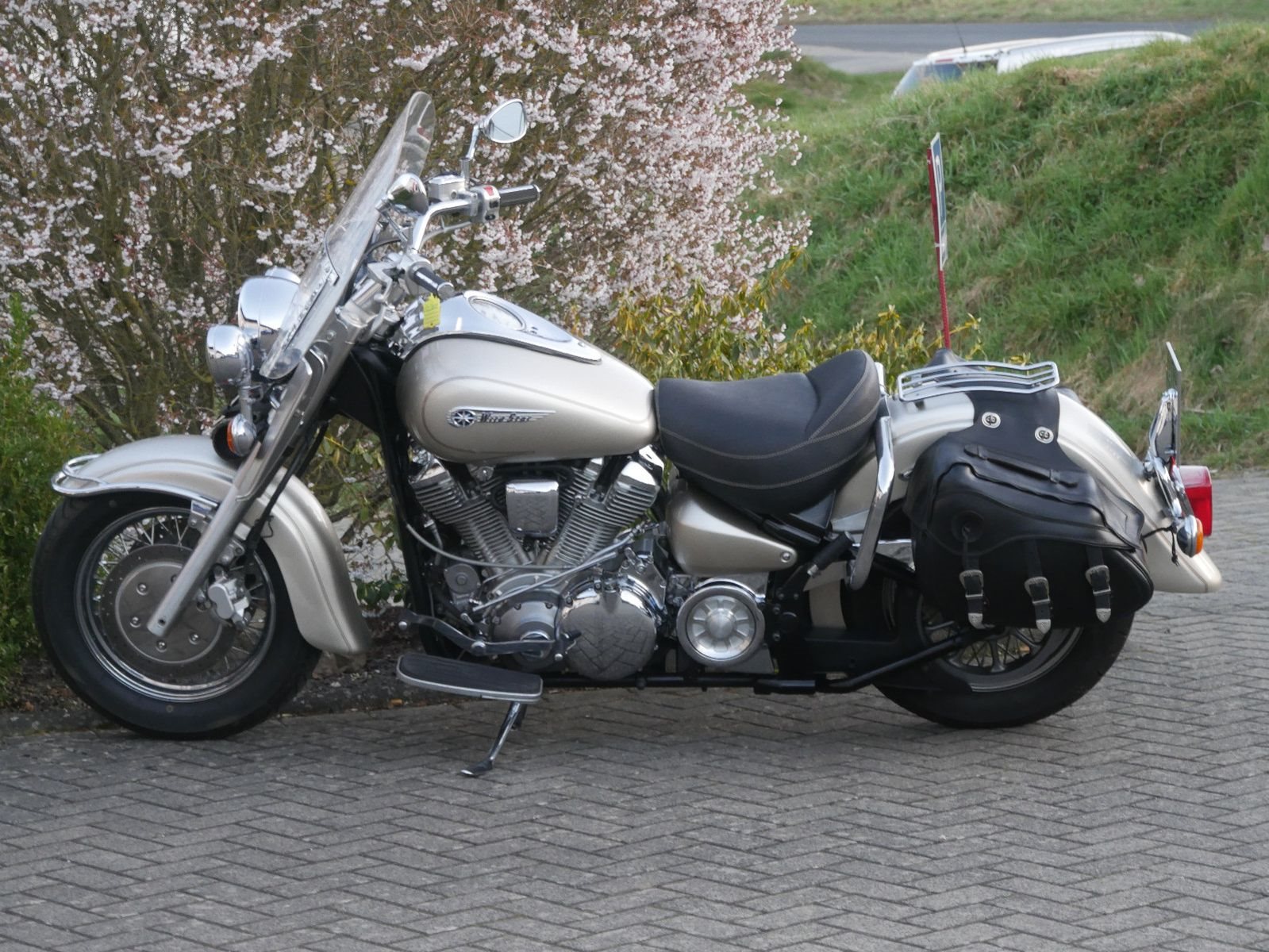 Yamaha Wild Star mit Windschild und Seitentaschen im Guten Zustand. Rechts unterhalb am Tank hat sie eine Delle ( siehe Foto ). Die letzte Inspektion war im Febraur 2023, bei 34.000km.